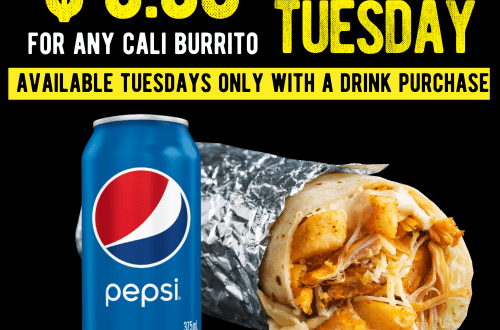 Read More$11.95 Cali Burrito Tuesdays: Available all day Tuesday for dine-in and take-away with the purchase of any drink.…