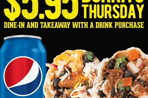 $5.95 Burrito Thursdays: Available all day Thursday for dine-in, take-away and online ordering with any drink purchase. Choose…